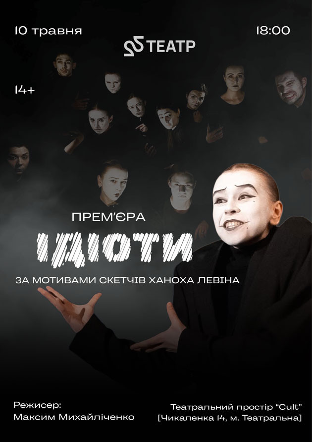 Прем'єра від 22 Театр - провокативна вистава «Ідіоти» по мотивам творів Ханоха Левіна. Перебіг абсурдних історій, де ти спочатку регочеш з персонажа, а через секунду стає не дуже смішно, бо здається… Готуємо для вас знайомство з нашим баченням історій відомого ізраїльського драматурга, який вишукано прокладає «між рядками» стьоб над речами, які у житті ми часто намагаємося приховати та сподіваємося, що крім нас самих цього ніхто не бачить Тож, вдягаємо білі маски, аби ніхто не здогадався, що саме ти разом із «Ідіотами» будеш шукати любов, говорити про бажання, тікати від самотності, сваритися, миритися, мовчати та сміятися з того, що насправді трохи(дуже) болить. 10 травня | неділя | 18.00 театральний простір "Cult" Чикаленка, 14 | М. Театральна Чекаємо тебе на вечорі відвертих зізнань разом із 22 Театр Тривалість: 1 год.30 хвилин Режисер: Максим Михайліченко, заслужений діяч мистецтв України, режисер театру на Липках, художній керівник та режисер 22 Театр.