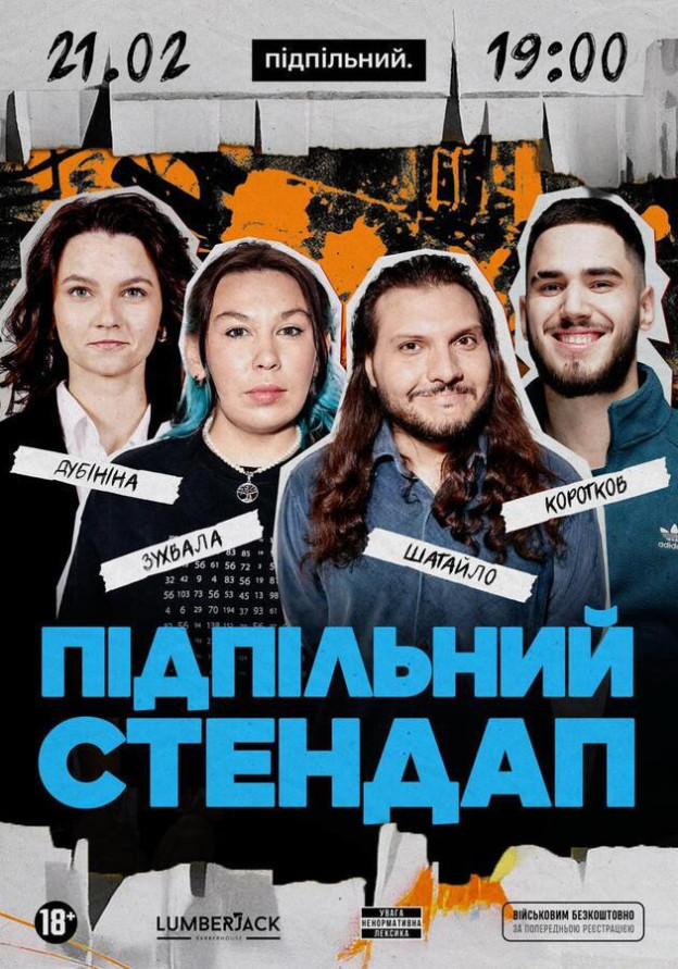 *вхід для бійців ЗСУ та ТРО - безкоштовний (за попереднім записом в інстаграм @undergroundstandupkyiv)