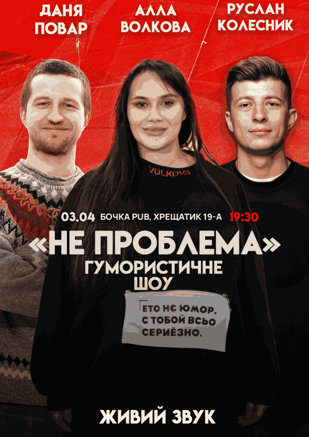 Приходьте, поділіться своїми історіями, і дозвольте комікам зробити їх вечірнім хітом! Ніякої серйозності – тільки сміх і позитив. Ціль шоу в тому, щоб ви вийшли від нас переконаними, що ваша проблема – НЕ ПРОБЛЕМА.