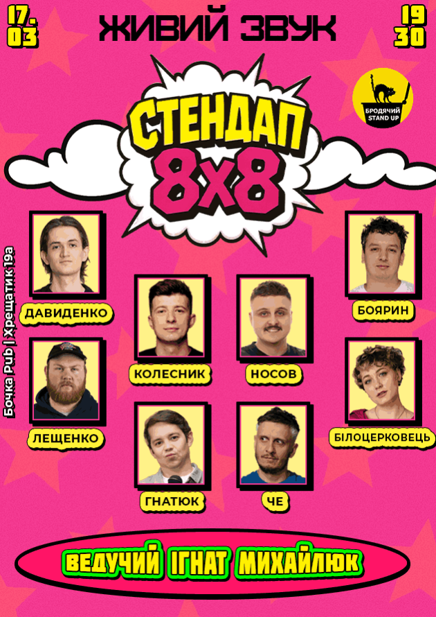 Цього вечора для вас виступатимуть 8 талановитих коміків, і кожен із них має лише 8 хвилин, щоб розсмішити вас до сліз своїми новими жартами! Це буде вечір свіжих ідей, несподіваних поворотів і вибухових моментів. Не пропустіть шанс стати частиною цього унікального стендап-шоу – вечора коротких, але яскравих виступів, де кожен комік покаже свій максимум.