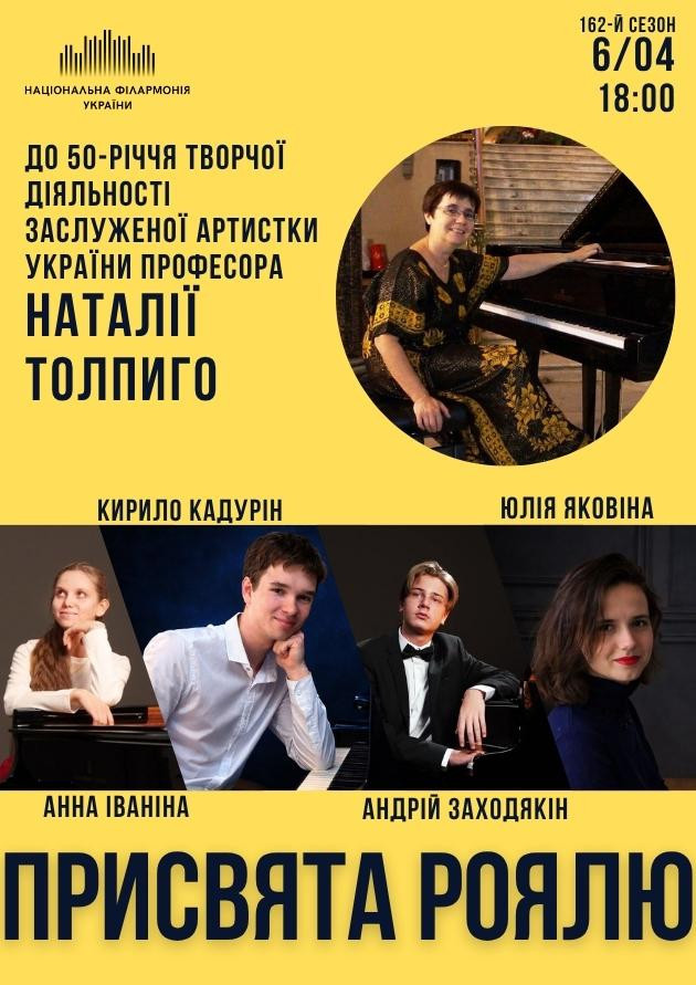 Über die Veranstaltung СЦЕНА – ДІТЯМ! Київський державний музичний ліцей імені М. В. ЛисенкаДо ювілею Наталії ТолпигоКонцерт веде Світлана Корецька