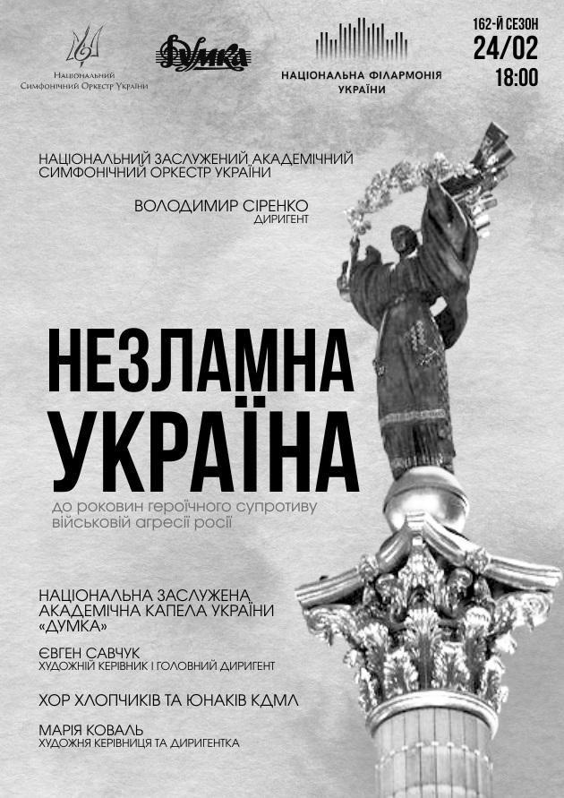 Національна філармонія України долучається до комплексу заходів, приурочених до роковин героїчного супротиву військовій агресії росії виконанням концертної програми, що містить знакові твори: Симфонію № 3 («Героїчну)» Людвіга ван Бетховена, «Україна. Музика війни» Євгена Станковича та Magnificat на тексти Кароля Войтили Якова Губанова. Це не лише музика абстрактної війни («Героїчну» Симфонію Бетховен спочатку присвятив Наполеону, проте згодом переосмислив її як величний епос про героїчну боротьбу, страждання та тріумф). Осердям вечора є музика свідка війни – визначного українського композитора Євгена Станковича. Його масштабний твір «Україна. Музика війни» для симфонічного оркестру і хору (2023 рік) – це музика болю за тисячами загиблих і надії на перемогу. За словами керманича «ДУМКИ» Євгена Савчука, це «маніфест про героїчну боротьбу українців за свободу і незалежність. Це присвята бійцям ЗСУ, які зараз мужньо воюють з російським окупантами. Це реквієм за тисячами загиблих через повномасштабну війну, розв’язану московитами. Це біль і сльози по закатованих. Це впевненість, що Україна переможе супостата».