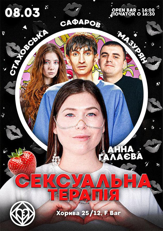 Сексуальна терапія - гумористичний захід, на якому комікі та кваліфікований сексолог намагаються вирішити анонімні проблеми глядачів!