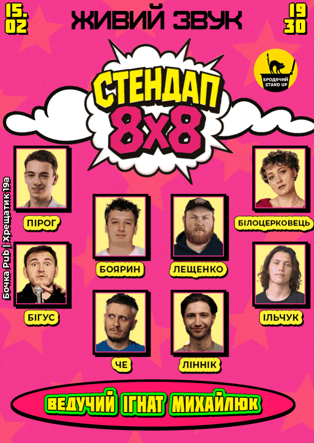 Цього вечора для вас виступатимуть 8 талановитих коміків, і кожен із них має лише 8 хвилин, щоб розсмішити вас до сліз своїми новими жартами! Це буде вечір свіжих ідей, несподіваних поворотів і вибухових моментів. Не пропустіть шанс стати частиною цього унікального стендап-шоу – вечора коротких, але яскравих виступів, де кожен комік покаже свій максимум.