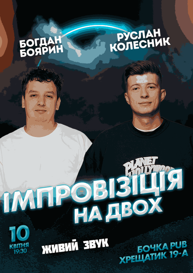 Вечір Імпровізації Богдана Боярина та Руслана Колесника — це незабутня подія для всіх, живе спілкування та справжні емоції. Руслан Колесник та Богдан Боярин будуть імпровізувати на сцені удвох. Талановиті коміки з неперевершеним почуттям гумору, запрошують всіх на вечір, де можна посміятися від душі, занурившись у їхні спостереження за повсякденним життям, стосунками, абсурдністю сучасного світу та особистими пригодами.