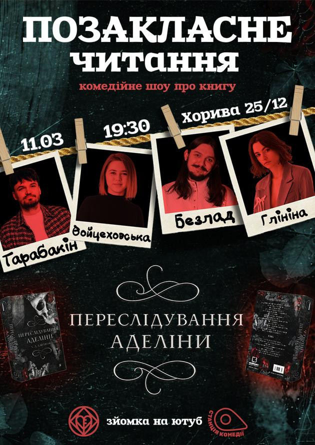 Запрошуємо вас на іронічний літературний розбір книги «Переслідування Аделіни» — темне, провокативне й місцями дуже незручне шоу, де напружений роман про одержимість, страх і небезпечну пристрасть стане приводом не лише затамувати подих, а й посміятися з власного «та ну чому знову він?!».