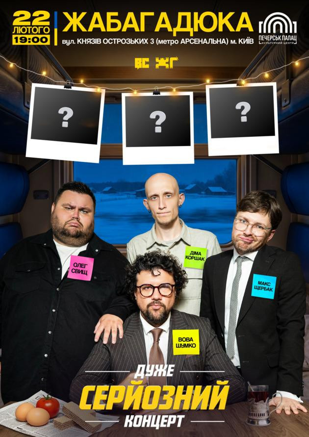 Attention. Very serious news from very serious people. On February 22, 2026, in Kyiv, namely at the Pechersk Palace Cultural Center, a very serious live concert by Jabagaduka (“Жабагадюка”) will take place. This format is an opportunity not only to laugh, but also to learn something new for yourself. In addition, by participating in Jabagaduka's “Дуже серйозний концерт” (en “Very Serious Concert”) in Kyiv, you will be contributing to a good cause. The artists actively support the Armed Forces of Ukraine and help purchase necessary equipment for defenders.