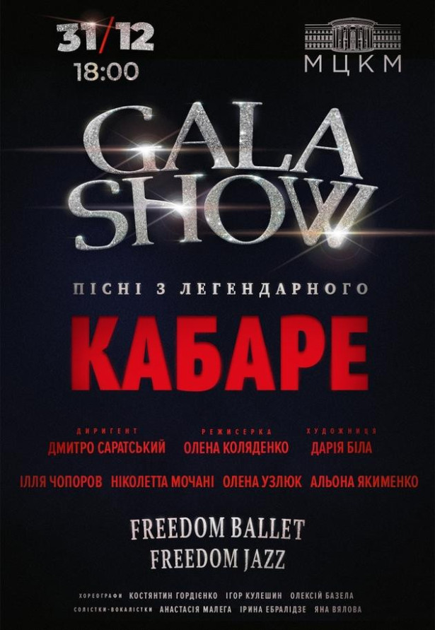 31 грудня сцена МЦКМ "Жовтневий" перетвориться на епіцентр блиску, музики, танцю та театральної магії. Саме цього вечора на глядачів чекатиме омріяне GALA SHOW, у якому прозвучать культові пісні з легендарного мюзиклу "Кабаре".