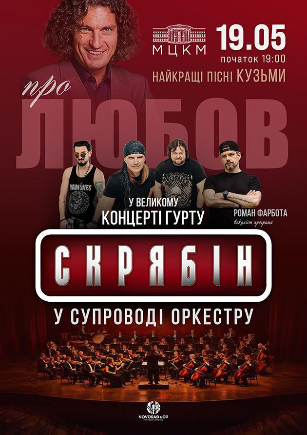 Любов, як сніг – накриє – не почуєш…    Найкращі пісні Андрія Кузьменка про найголовніше у виконанні його легендарного гурту Скрябін у супроводі симфонічного оркестру в МЦКМ   Пісні Андрія про Любов… дістають самого серця.  Шампанські очі, Останній танець, Шмата, Не даєш, Мовчати, Місця щасливих людей.. Спи собі сама… Їх співаєш, їх танцюєш, з ними плачеш… і з ними смієшся… ними можна сказати про усе.    На сцені МЦКМ на вас очікує найкайфовіша суміш:  -романтичні та найщиріші пісні легендарного Андрія Кузьменка -в оригінальному виконанні музикантів його гурту Скрябін - ті ж самі гітари і барабани, ті ж партії, ті ж самі потужні й щирі Льоша, Костік і Вадос  -вокаліст спеціальної програми -  талановитий співак, військовослужбовець Нацгвардії України Роман Фарбота.   -у супроводі урочистого і  професійного Симфонічний оркестру    Війна зробила нас жорсткішими, але від того наша любов стала ще потужніша. І лише в цей день ми дозволимо собі бути вразливими.. в любові до тих, заради кого все.   Приходь співати про Любов разом із нами.   З любов'ю, ваш гурт Скрябін
