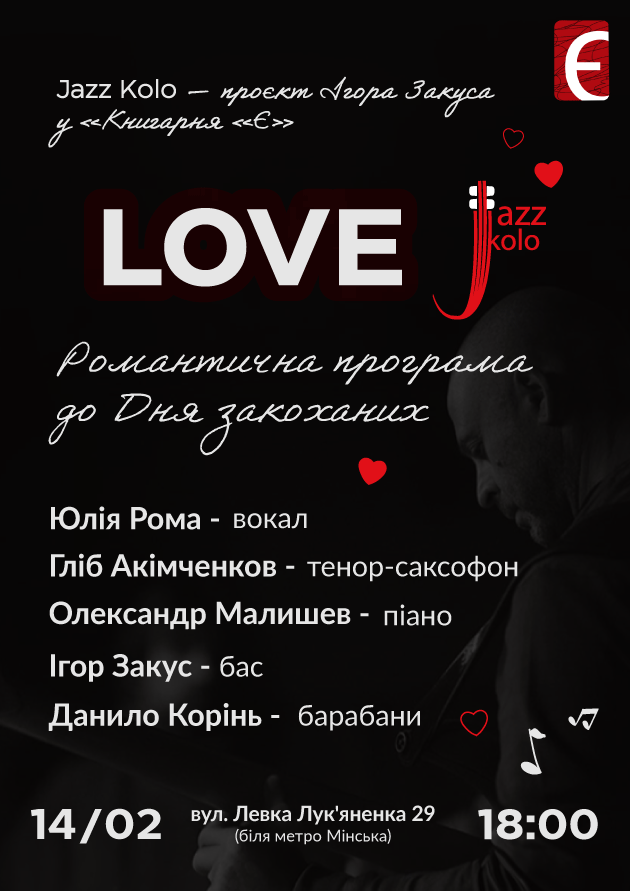 Цього Дня святого Валентина запрошуємо вас на особливий вечір у Книгарні «Є». Проєкт Ігоря Закуса Jazz Kolo підготував неймовірно чуттєву програму «LOVE».