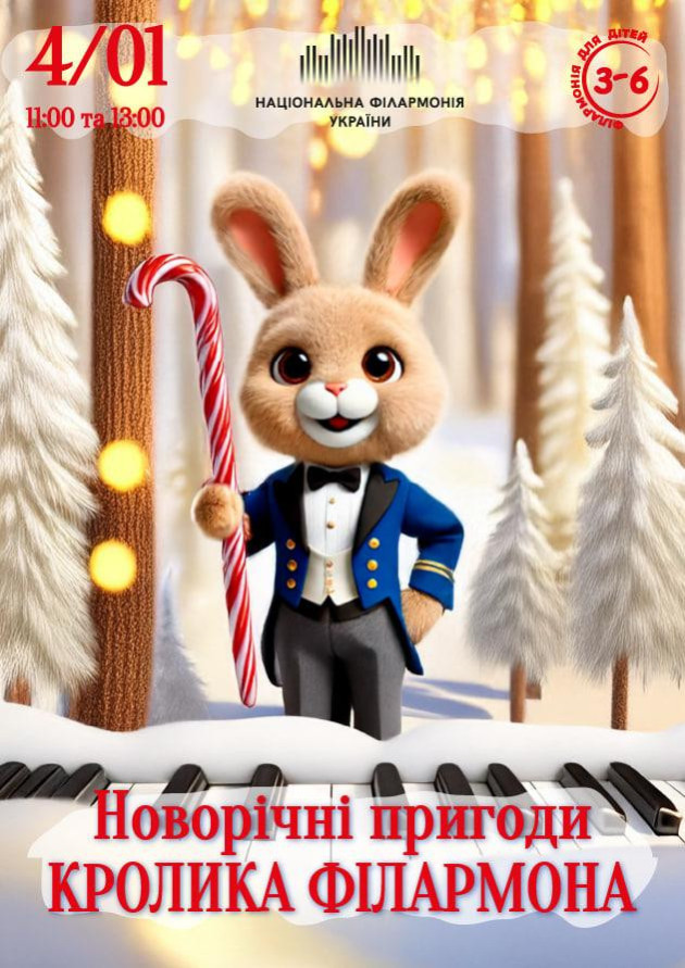 У перші новорічні вихідні, 4 і 5 січня наймолодших меломанів від 3-х до 6-ти років у Музичному салоні філармонії, – очікують «Новорічні пригоди Кролика Філармона».
