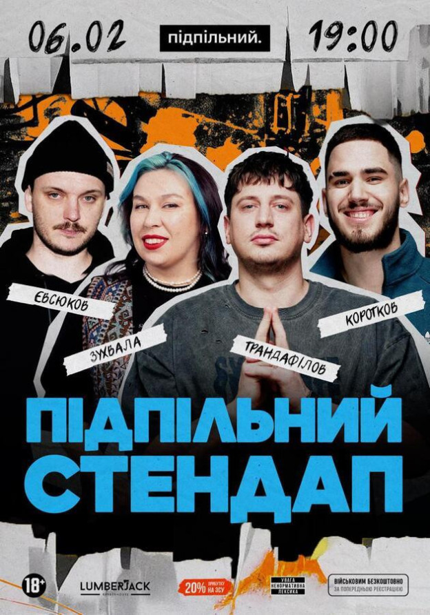 *вхід для бійців ЗСУ та ТРО - безкоштовний (за попереднім записом в інстаграм @undergroundstandupkyiv)