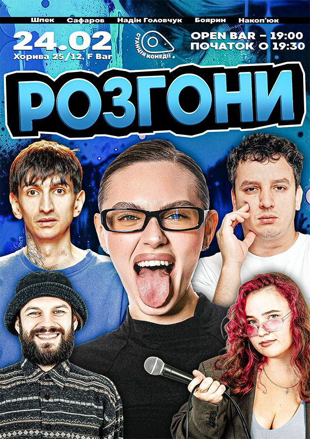 Вас чекає легендарне імпровізаційне шоу «Розгони» — шоу, де професійні коміки розповідають історії або життєві спостереження та разом накидують на них жарти. Побач процес написання стендапу на власні очі!