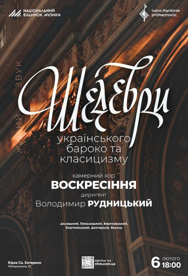 Запрошуємо у подорож світом українського бароко та класицизму, де музика оживає у кожному серці. Лунатимуть шедеври Дмитра Бортнянського, Миколи Дилецького, Максима Березовського, Артемія Веделя та їхніх сучасників — духовна велич, що торкається самого серця. Відчуйте неповторну атмосферу старовинних партесних концертів — живу історію нашої музичної душі.