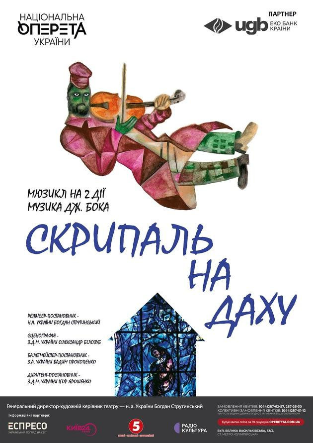 У традиційній культурі музикант-скрипаль супроводжує всі етапи життя єврейської родини. Він став символом життєвого укладу, знаковим образом поєднання усталеності і свободи. Мюзикл «Скрипаль на даху» Національної оперети України – спроба сучасного відображення складного поєднання розбіжностей життя. Філософська і лірична постановка, де у сценічній реальності акторського буття грають музика, колір, безмежні почуття.