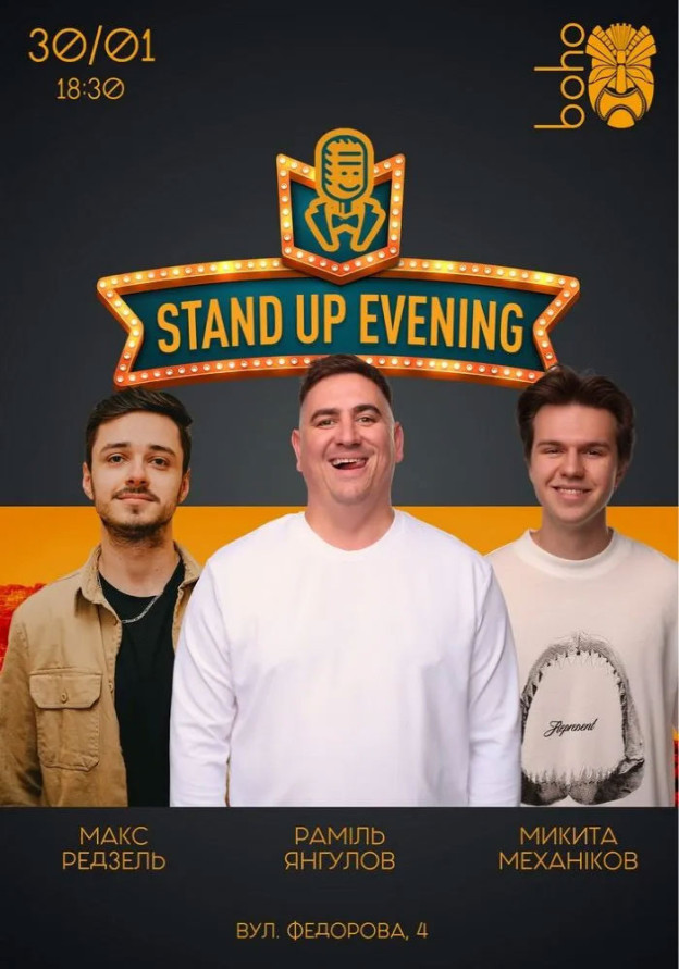 У п'ятницю, 30 січня, на сцені ресторану «Boho» виступатимуть справжні зірки українського стендапу: Макс Редзель, Микита Механіков, Раміль Янгулов.