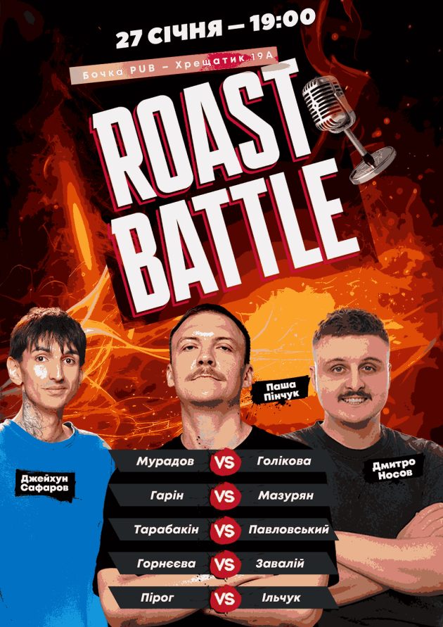 Roast Battle — це формат, у якому коміки виходять на сцену, щоб публічно знищувати одне одного жартами. Без цензури, без гальм — гострий гумор, швидкі панчі і сміх до сліз.