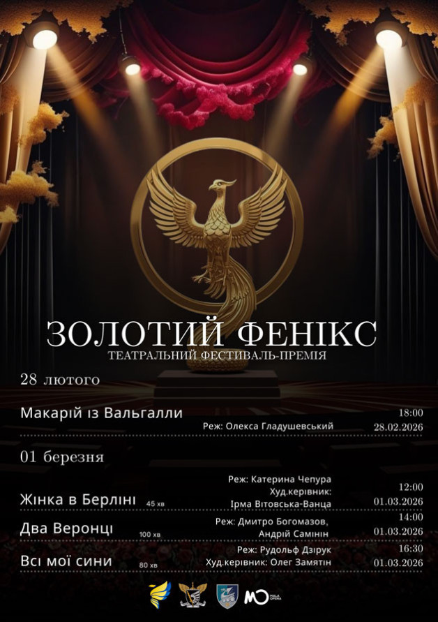 Театральний фестиваль-премія «Золотий Фенікс» 28 лютого – 1 березня у Київській малій опері вдруге відбудеться театральний фестиваль-премія «Золотий Фенікс». Подія проходить на підтримку захисників 36-ї та 79-ї бригад ЗСУ та об’єднає провідних митців сучасної української сцени. Фестиваль стане простором прем’єр професійних митців та молодих акторів, творчих зустрічей і яскравої конкурсної програми, де визначатимуть кращу режисерську роботу, кращу виставу, кращого актора та кращу акторку. 28.02 о 18:00 У рамках відкриття фестивалю відбудеться прем’єра вистави «Макарій із Вальгалли». Режисер — Олекса Гладушевський Автор — Юрій Вєткін 01.03 — Фінал конкурсної програми У фінальний день глядачі побачать вистави-номінанти, які змагатимуться за головні відзнаки фестивалю: 12:00 — «Жінка в Берліні» Режисерка — Катерина Чепура Художня керівниця — Ірма Вітовська-Ванца 14:00 — «Два Веронці» за п’єсою Вільяма Шекспіра Режисери-постановники — Дмитро Богомазов та Андрій Самінін 16:30 — «Всі мої сини» Режисер — Рудольф Дзірук Художній керівник — Олег Замятін О 19:00 відбудеться урочиста церемонія нагородження та закриття фестивалю. «Золотий Фенікс» знов повстає, як символ відродження, сили та єдності української культури. Запрошуємо долучитися до події, що поєднує театральне мистецтво та важливу благодійну місію підтримки наших захисників.