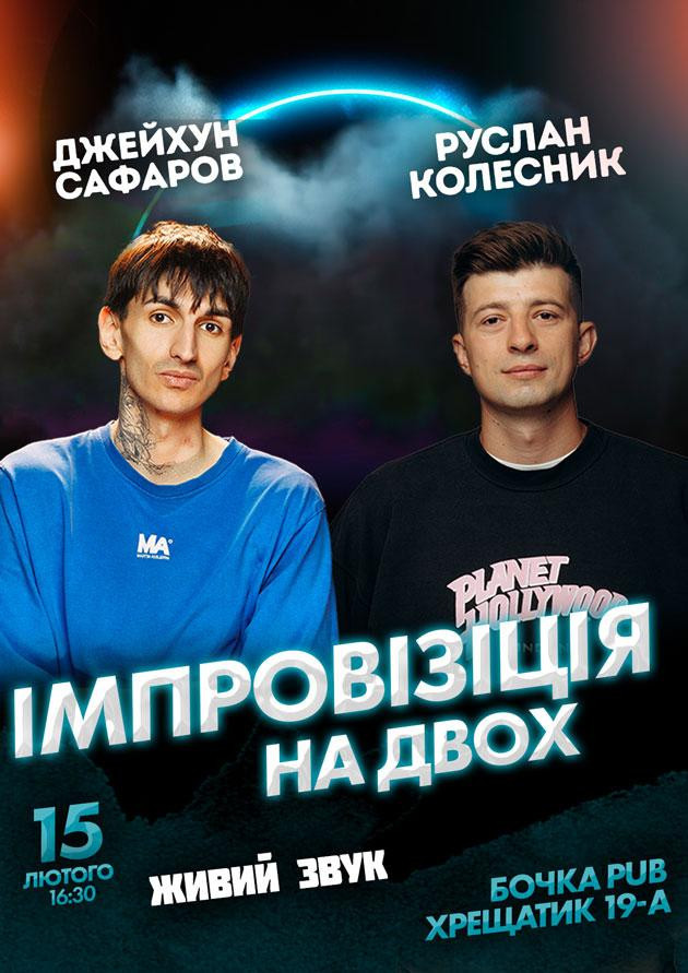 Вечір Імпровізації Джейхуна Сафарова та Руслана Колесника— це незабутня подія для всіх, живе спілкування та справжні емоції. Руслан Колесник та Джейхун Сафаров будуть імпровізувати на сцені удвох. Талановиті коміки з неперевершеним почуттям гумору, запрошують всіх на вечір, де можна посміятися від душі, занурившись у їхні спостереження за повсякденним життям, стосунками, абсурдністю сучасного світу та особистими пригодами.