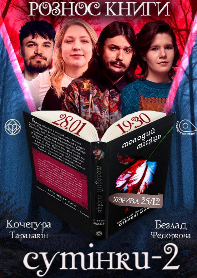Запрошуємо вас на комедійний рознос книги «Сутінки. Повний місяць» — це легке комедійне шоу, де культовий вампірський роман Стефані Маєр перетворюється на привід добре посміятися.