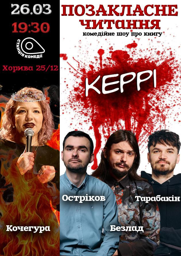 Запрошуємо на іронічний літературний розбір «Керрі» Стівена Кінга — з дорослими жартами, темним гумором і чесною розмовою про підліткову жорстокість, самотність і той момент, коли «тихенька дівчинка» перестає терпіти.