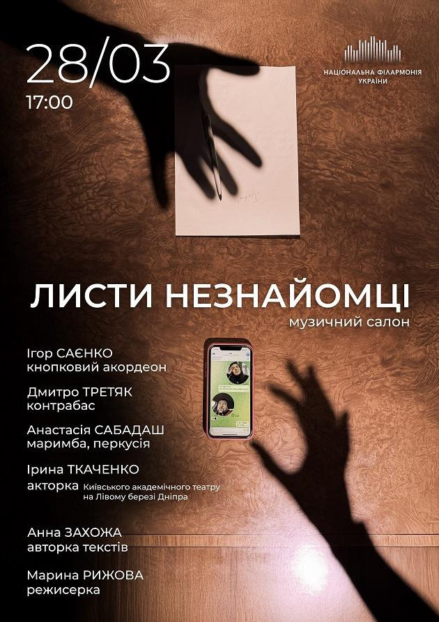 Apie renginį Листи Незнайомціна тексти Анни ЗахожоїІгор Саєнко кнопковий акордеонДмитро Третяк контрабасАнастасія Сабадаш ксилофон, перкусіяДіана Коваль акторкаРежисерка Марина РижоваМузичний салон