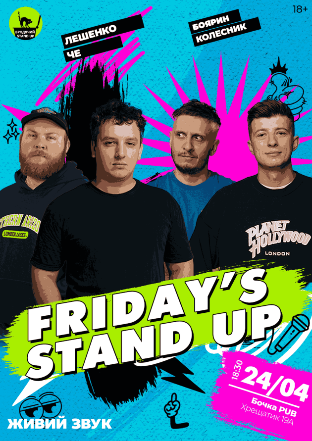 Цієї п'ятниці ми даємо вам унікальну можливість насолодитися непередбачуваним і, місцями, вульгарним гумором від крутих київських коміків, у закладі, розташованому в самому центрі нашої неосяжної столиці. Формат вечора передбачає перебування виступаючого на сцені довше звичайного, що дозволяє не намагатися скоротити думку, а максимально розгорнути глядачеві свій матеріал.