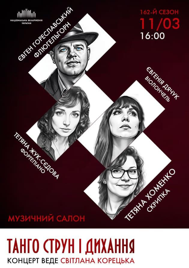 «Танго струн і дихання» – це камерний проєкт, у якому ансамбль переплітає емоційну драматургію танго з камерною інтимністю. Струни створюють пристрасну, часом ніжну тканину звучання, фортепіано тримає пульс і драматичну глибину, а флюгельгорн додає «дихання» – теплий, майже людський тембр, що оживляє мелодію. Це не просто виконання танго – це діалог між подихом і струнами, між тілесністю танцю і камерною медитативністю.
