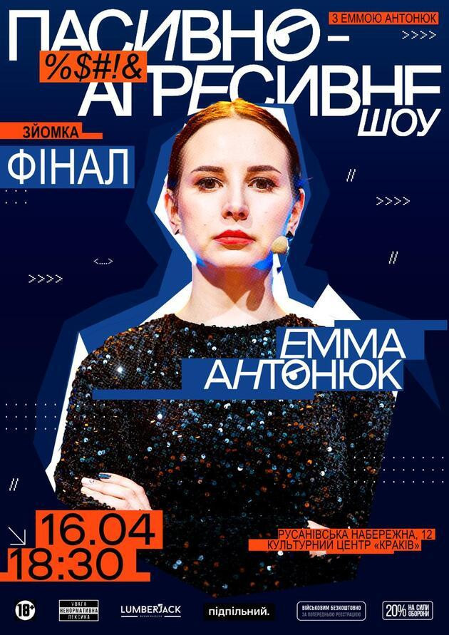 Запрошуємо на стендап-шоу «Пасивно-Агресивне» з Еммою Антонюк. Це новий проєкт від Підпільного Стендапу, де коміки змагаються за звання найсмішнішого. Вони пройдуть кілька етапів випробувань, щоб зʼясувати хто дійсно володіє почуттям гумору, а кому пора шукати нову роботу!