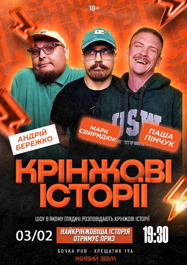 Привіт , запрошуємо вас на шоу «КРІНЖОВІ ІСТОРІЇ» Шоу в якому глядачі розповідають крінжові історії, найкрінжовіша історія вечора отримує приз (ГЛЯДАЧ МОЖЕ ВЗЯТИ УЧАСТЬ В ШОУ) Це комедійний Івент з домашньою ламповою атмосферою який вам точно сподобається! Приходьте завчасно, так як буде відбуватись зйомка. Під час шоу замовлення не приймаються) Коміки: 1. Андрій Бережко @andreyberezhko 2. Паша Пінчук @pasha_pinchuk 3. Марк Свиридюк @sviridyuk.mark44 Коли: 03/02 19:30 Де: Бочка Pub (Хрещатик 19А) Підписуйтесь на Бродячий Стендап в Instagram, щоб знати про всі наші заходи заздалегідь 18+