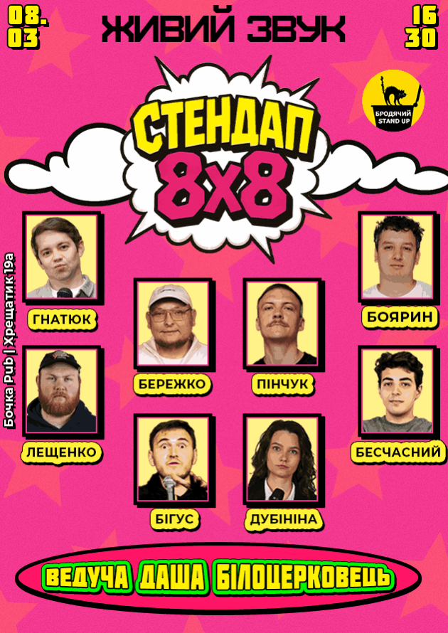 Цього вечора для вас виступатимуть 8 талановитих коміків, і кожен із них має лише 8 хвилин, щоб розсмішити вас до сліз своїми новими жартами! Це буде вечір свіжих ідей, несподіваних поворотів і вибухових моментів. Не пропустіть шанс стати частиною цього унікального стендап-шоу – вечора коротких, але яскравих виступів, де кожен комік покаже свій максимум.