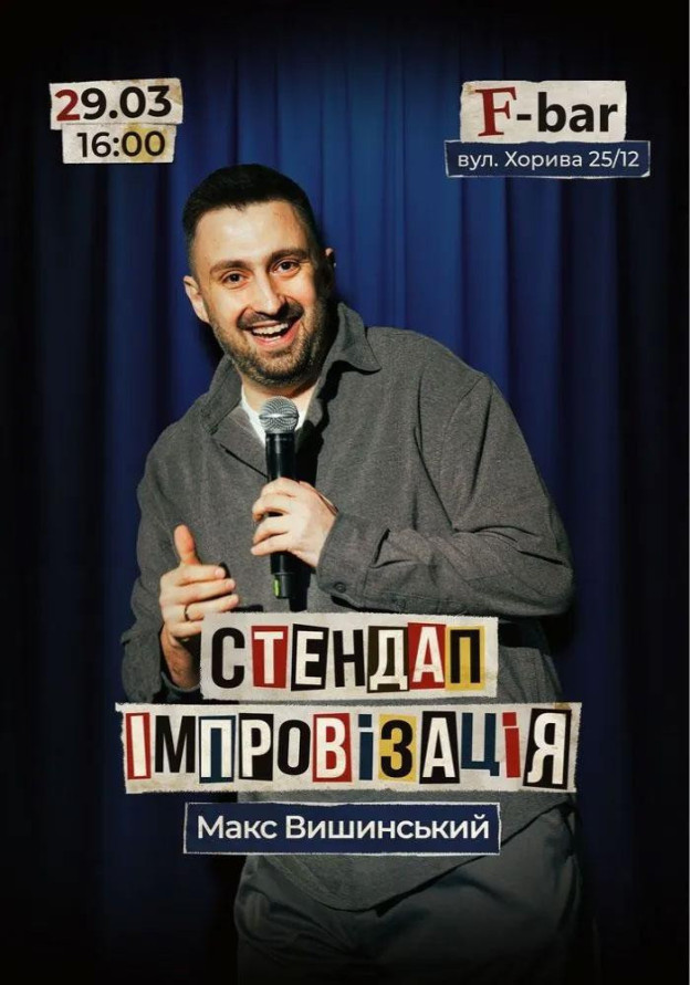 У неділю, 29 березня, популярний комік Макс Вишинський запрошує на вечір стендап-імпровізації! Це формат, де глядачі створюють комедію, спілкуючись з артистом «тут і зараз».