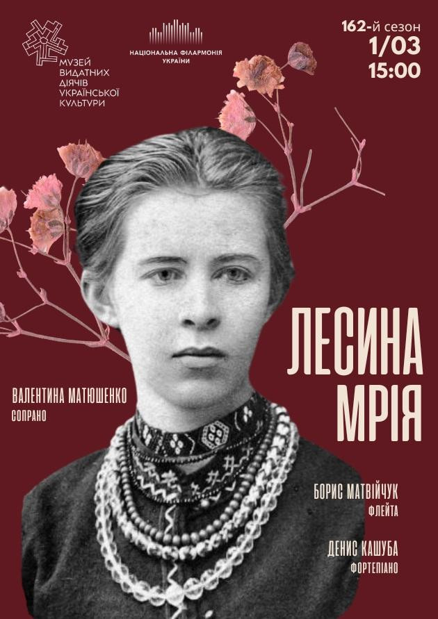 Despre eveniment Лесина мріяВалентина Матюшенко сопраноБорис Матвійчук флейтаДенис Кашуба фортепіаноКонцерт веде Наталія Насікан