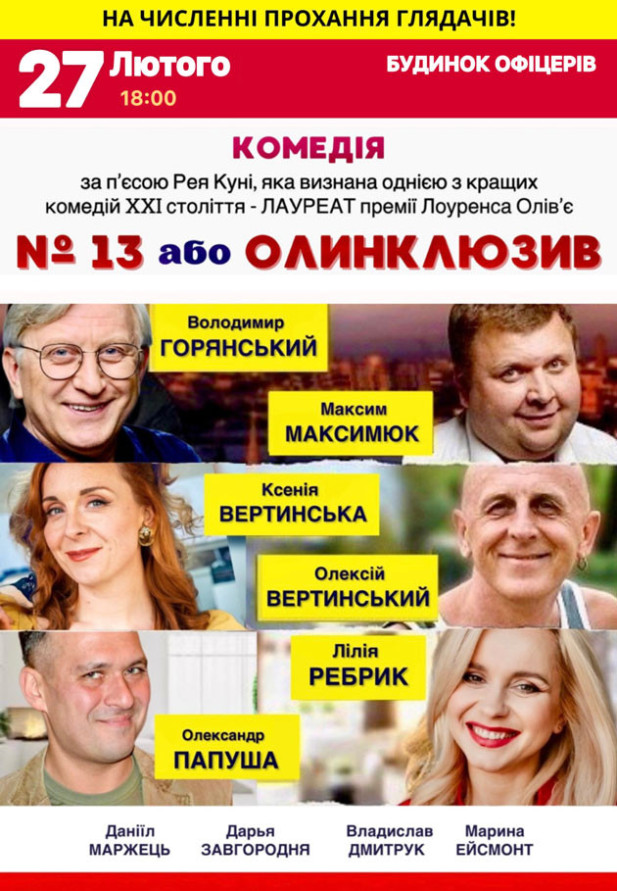 №13 або Олинклюзив за п'єсою Рея Куні, яка визнана однією з кращих комедій XXI століття - ЛАУРЕАТ премії Лоуренса Олів'є.