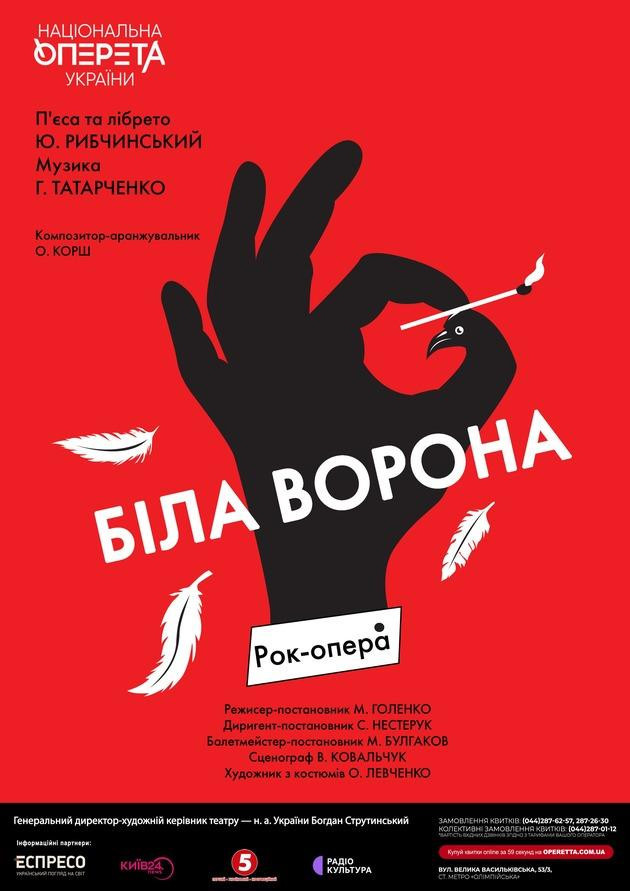 На сцене Киевского национального академического театра оперетты пройдет версия знаменитой рок-оперы “Белая ворона” в Киеве. В основе этой музыкальной постановки лежит одноименная поэма Ю. Рыбчинского, положенная на музыку композитора Г. Татарченкова. Это была первая на момент начала 90-х собственно украинская рок-опера, которая быстро приобрела форму настоящего художественного взрыва. Мелодии оперы и насыщенные экспрессией композиции отлично подходили под острые смысловые акценты в сюжете и накладывались на драматические события постановки, порождая оглушительный кумулятивный эффект на зрителя.