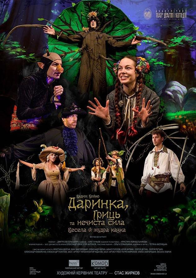 Приглашаем в Театр драмы и комедии на левом берегу Днепра на детский спектакль по произведению Вадима Бойко «Даринка, Грыць и Нечистая сила». Это временами смешная, а порой трогательная история о девочке Даринке, которая отправляется на поиски своего любимого казака Грыця и находит его в земле Нечистой силы, в плену у Лысого Черта, он же Люцифер Вельзевульський. Там вокруг туман и мрак, не цветут цветы и не поют птички.