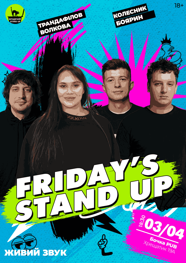 Цієї п'ятниці ми даємо вам унікальну можливість насолодитися непередбачуваним і, місцями, вульгарним гумором від крутих київських коміків, у закладі, розташованому в самому центрі нашої неосяжної столиці. Формат вечора передбачає перебування виступаючого на сцені довше звичайного, що дозволяє не намагатися скоротити думку, а максимально розгорнути глядачеві свій матеріал.