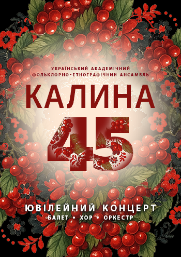 Не пропустите яркий праздник украинской музыки и танца! Украинский академический фольклорно-этнографический ансамбль “Калина” отмечает 45-летие! Юбилейный концерт известного в Украине и за ее пределами творческого коллектива, удачно совмещающий народные традиции с современными элементами.