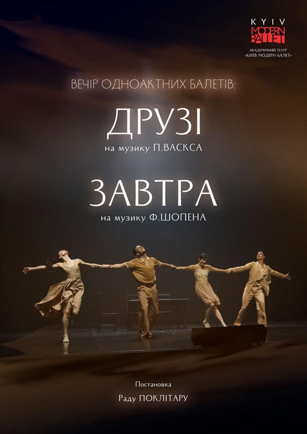 Два балета “Друзі” и “Завтра” в постановке Раду Поклитару позволят вам почувствовать невероятную силу искусства. Оцените фантастическую хореографию, мощные выступления артистов и отличную музыку П. Васкса и Ф. Шопена. Всё это образует идеальный симбиоз, в котором все части дополняют друг друга.