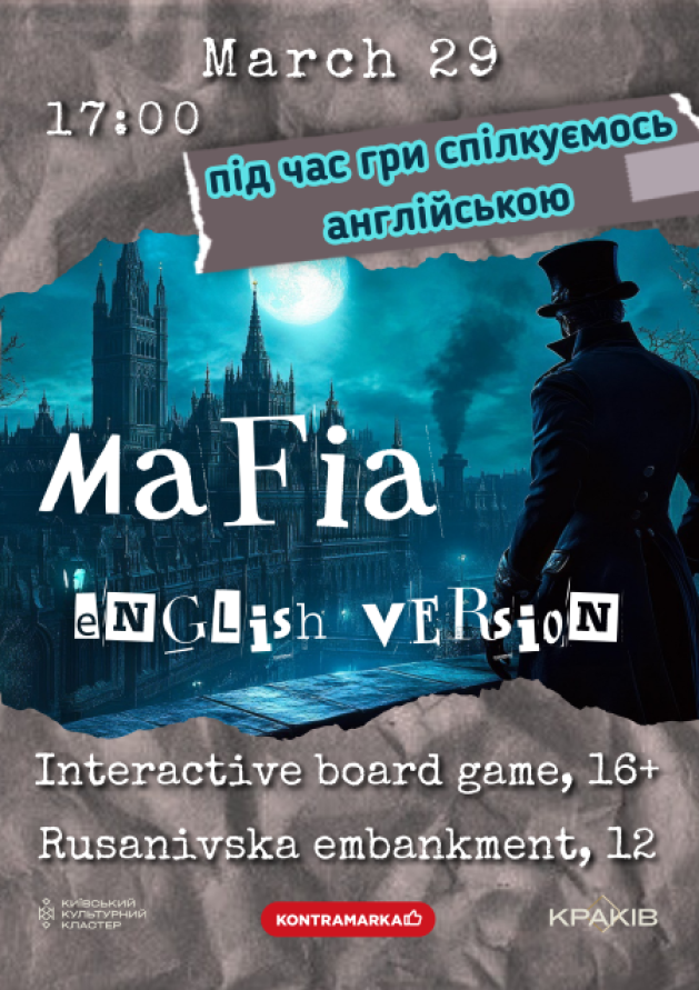 Запрошуємо на нашу "Мафію"!! Цього разу під час гри спілкуємося англійською. Атмосфера гри допоможе зняти напругу та легко почати говорити.