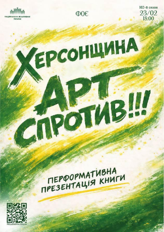 В рамках «Філармонії Нескорених» відбудеться показ спільного проєкту Національної філармонії України та Херсонського академічного музично-драматичного театру ім. М. Куліша – перформативна презентація книги «Херсонщина. Арт-спротив» про Херсон та деокуповану частину області.