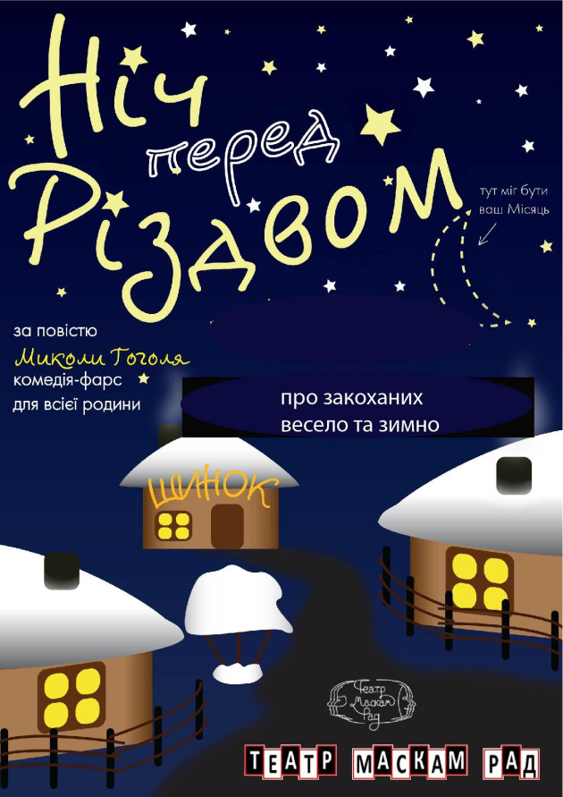 "Ніч перед Різдвом" – зимова казка за повістю славетного українського письменника Миколи Гоголя. Тут є всі улюблені Гоголем та народною українською міфологією персонажі: Відьма, Чорт, козак-характерник Пацюк і чарівні перевтілення. За один вечір ви зможете побувати в різдвяному засипаному снігом селі Диканька на Полтавщині та в холодному не гостинному імперському Санкт-Петербурзі. Калейдоскоп яскравих персонажів та картинок, які «перегортаються» прямо на очах у глядача.