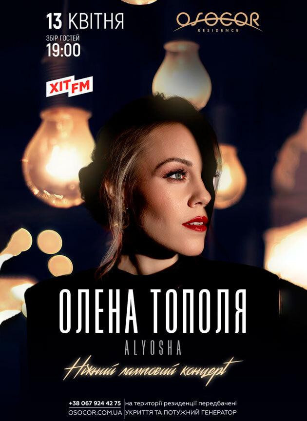 Елена Тополя (ex-ALYOSHA) представит публике особую программу в акустическом “ламповом” звучании. На концерте прозвучит около 18 песен. Это уже хорошо известные хиты, а также новые, еще не изданные песни: “Трепетно”, “Оленка”, “Мій Бог”, Like a bird, Amazon.