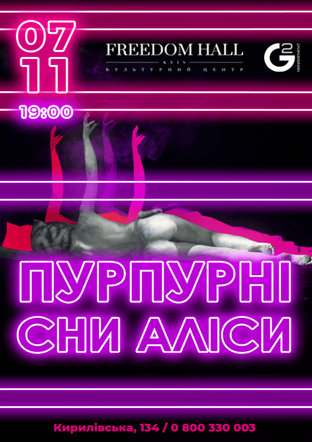 7 ноября 2020 года в Freedom Hall в Киеве состоится невероятное иммерсионное шоу от режиссера Александра Брайловского- «Пурпурные сны Алисы» по мотивам известной сказки Льюиса Кэрролла. Вас ждет сказочное путешествие в страну чудес, где нет границы между актерами и зрителями. Ведь зрители в этот вечер будут частью самого действа.