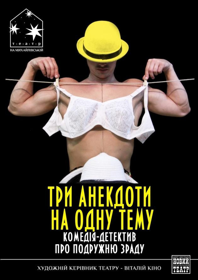 В театре на Михайловской в Киеве состоится комедия-детектив о супружеской измене «Три анекдота на одну тему» по мотивам произведений Панаса Мирного, Антона Чехова и Стефана Цвейга, посвященных супружеской измене. Из истории в историю зрителей ведут два детектива, следящие за мужчиной и женщиной.
