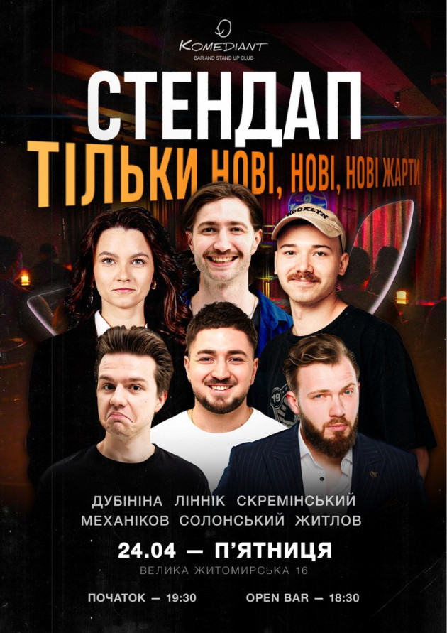 Тільки нові, нові, нові жарти Жодного старого матеріалу. Жодної «перевіреної класики». Тільки те, що народилося буквально вчора — і може прозвучати занадто сміливо вже 24 квітня. Це вечір, де коміки ризикують. Де жарти ще гарячі. Де хтось у залі точно подумає: «Ого… а що, так можна було?» Гостро. Зухвало. Незручно. Відверто. І, головне, по-справжньому смішно. Приходь почути нові жарти першим