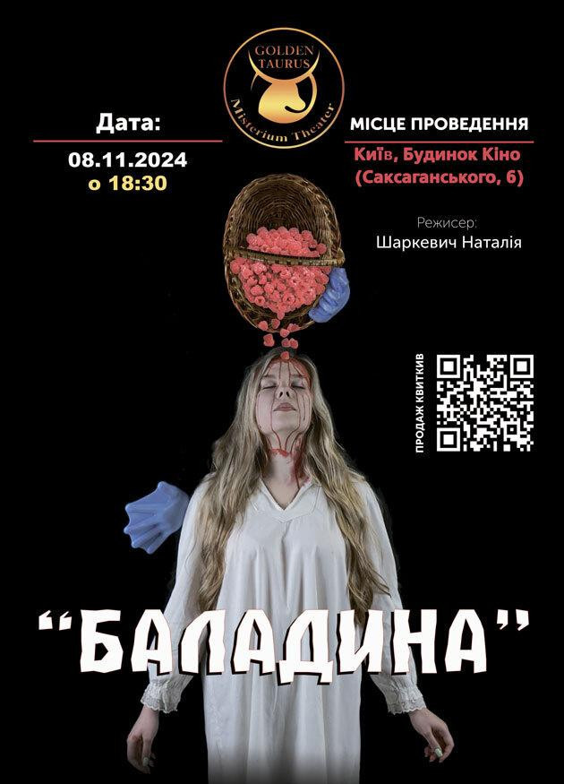 ГОЛДЕН ТАУРУС МІСТЕРІУМ ТЕАТР презентує : 08 листопада о 18:30 на сцені Будинку Кіно відбудеться вистава «Баладина» Ю. Словацього.