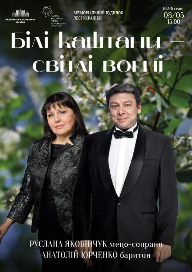 Про подію Білі каштани – світлі вогніРуслана Якобінчук мецо-сопраноАнатолій Юрченко баритонАнна Поліщук фортепіаноКонцерт веде Наталія Насікан