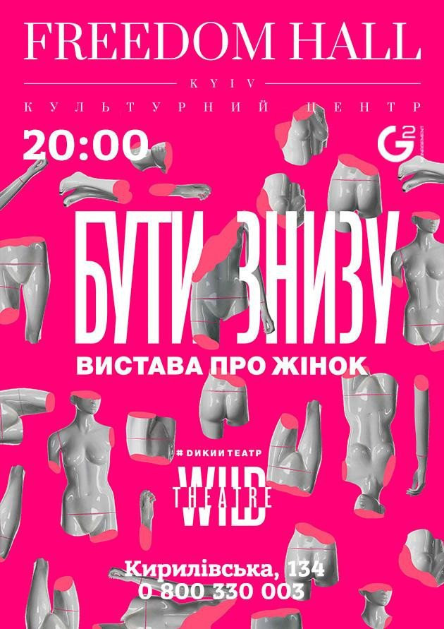 У концертно-театральному центрі Freedom Hall (Фрідом Холл) зустрічайте виставу Дикого театру про жінок «Бути знизу» в Києві. На вас чекають долі трьох зовсім різних жінок: жінка-рабиня, жінка-богиня і жінка-«залізні яйця». Але всі вони зустрілися на тренінгу «Як стати щасливою». Бо щастя — це саме те, чого не вистачає усім трьом.