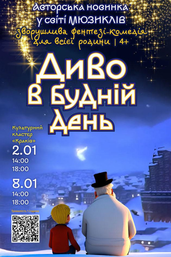 «Диво в будній день» - захоплююча історія, яка не лишить байдужими ані дітей (4 плюс), ані дорослих. Реальність та фентезі переплітаються в одну розповідь про хлопця на ім’я Влад, який через обставини, що склались навколо нього, поступово втрачає віру в себе. Потрапивши у міжчасся, він знайомиться із загадковим та комічним персонажем, про якого ніхто до цього в світі не знав. Він допомагає Владу віднайти віру в себе та в диво, яке трапляється з кожним з нас, навіть у звичайний будній день. То, що ж сталось з Владом? І хто той загадковий персонаж? Ти обов’язково дізнаєшся, якщо прийдеш до нас!